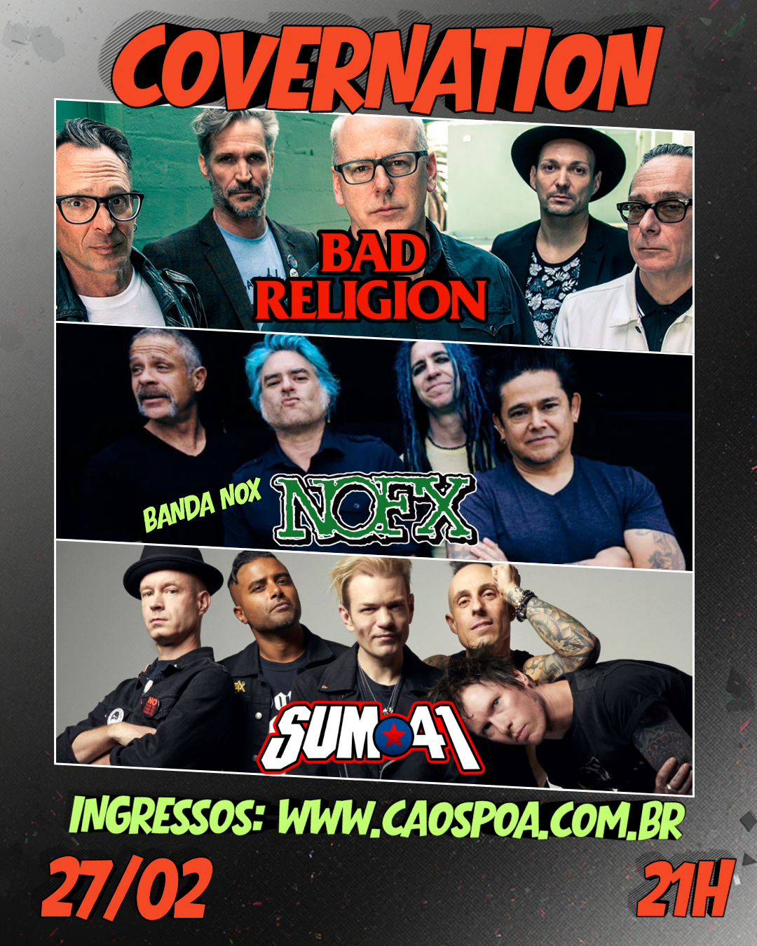 Então vamos lançar a braba no VERÃO CAOS com a CoverNation #1 que terá a Wrong Way Kids tocando BAD RELIGION, a NOX tocando NOFX, e a Sum 8e7 tocando SUM41!!!