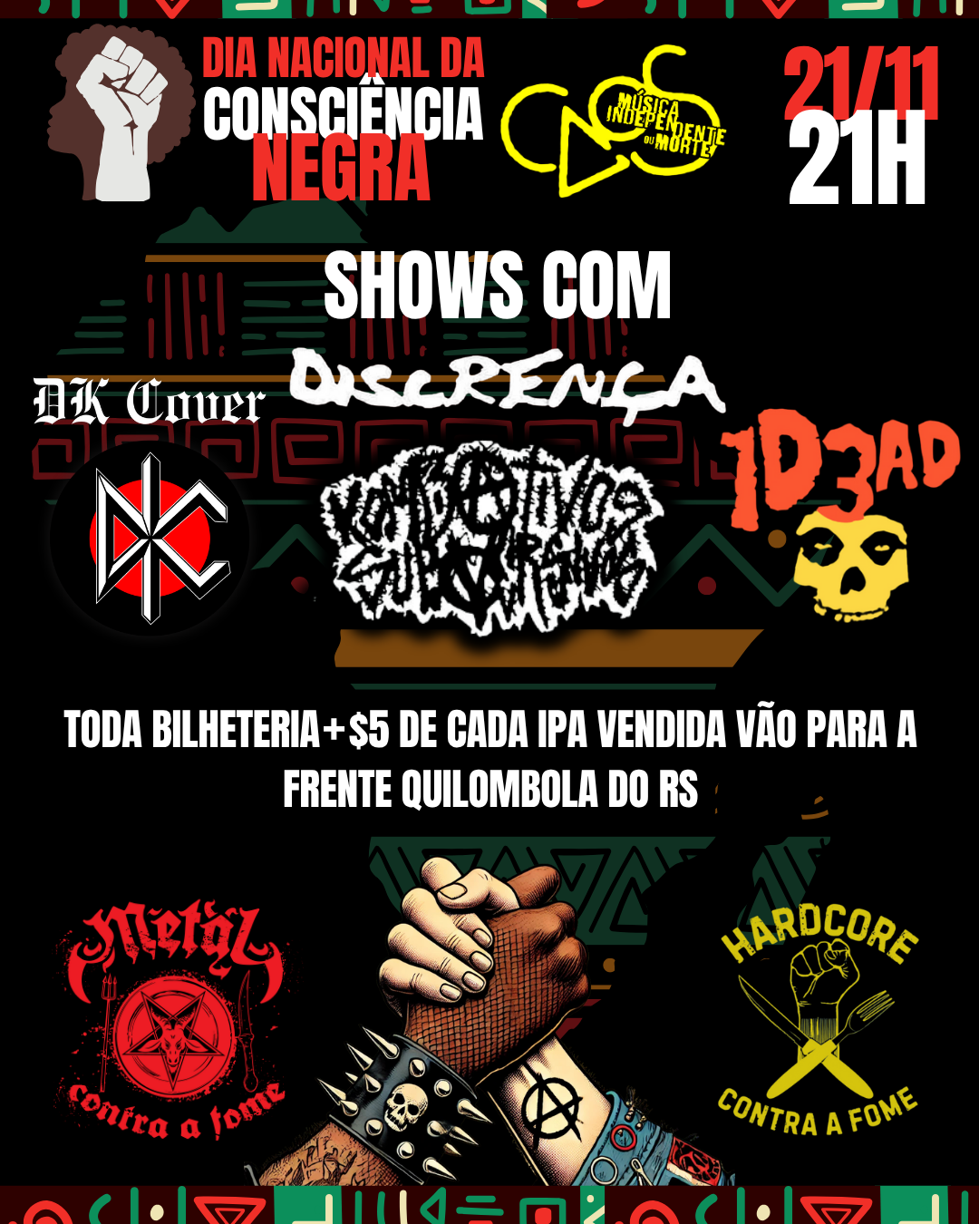 Toda a bilheteria do evento será revertida para fortalecer essa resistência viva, com ingressos a R$5 e R$10 antecipados e R$15 na hora, destinados ao Quilombo Kédi através da Frente Quilombola do RS, para cobrir os custos judiciais e os reparos urgentes do território. Além disso, o Caos também entra na roda: a cada IPA vendida no dia, R$5 vão direto para a Frente Quilombola do RS, que acompanhará o uso dos recursos junto ao Quilombo e outras demandas do movimento. Quer contribuir mais? Manda o valor pro emaildocaos@gmail.com que repassaremos e prestaremos conta!