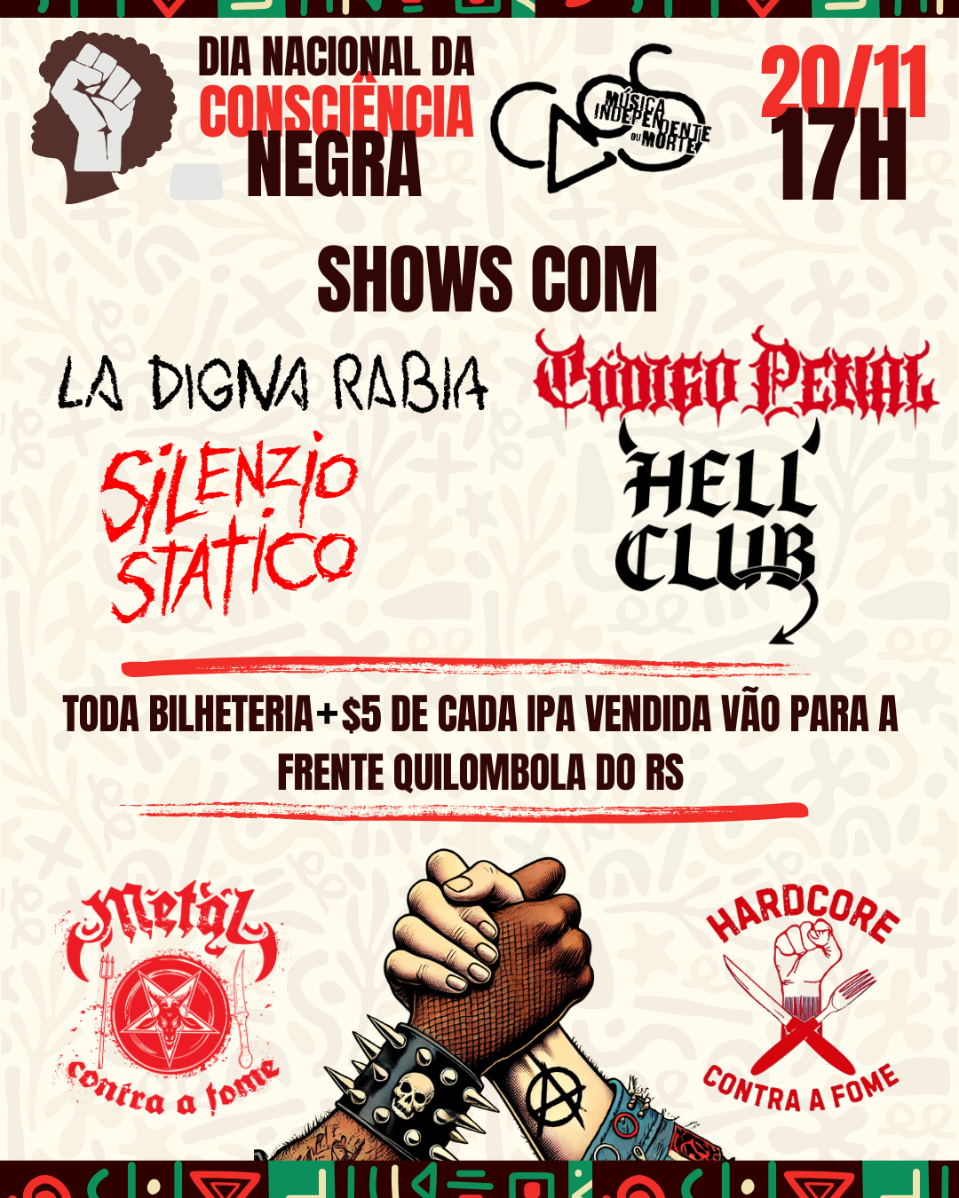 Ecoando no palco as INCRÍVEIS Código Penal, La Digna rabia, Silenzio Statico e Hell Club, unindo ainda os projetos Hardcore e Metal Contra a Fome!